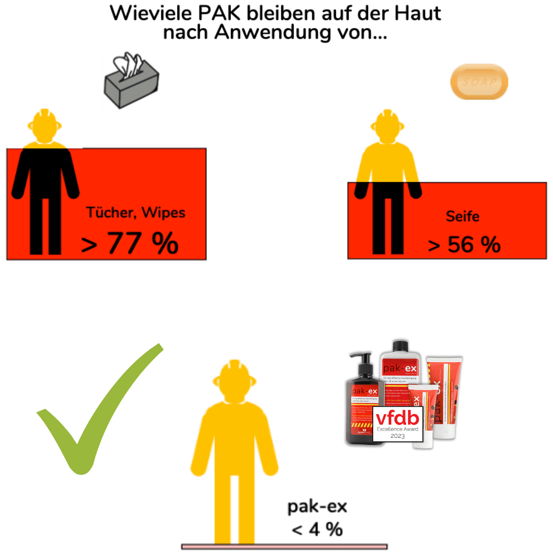 Die effektive Reinigung durch pak-ex verhindert die Aufnahme von PAK über die Haut bzw. spätere orale Aufnahme infolge von Kontaminationsverschleppung. pak-ex entfernt mehr als 96% der PAK. Die hautverträgliche Formulierung ist frei von Seifen und entfettenden Komponenten, um die Barriereeigenschaften der Haut nicht zu beeinträchtigen.